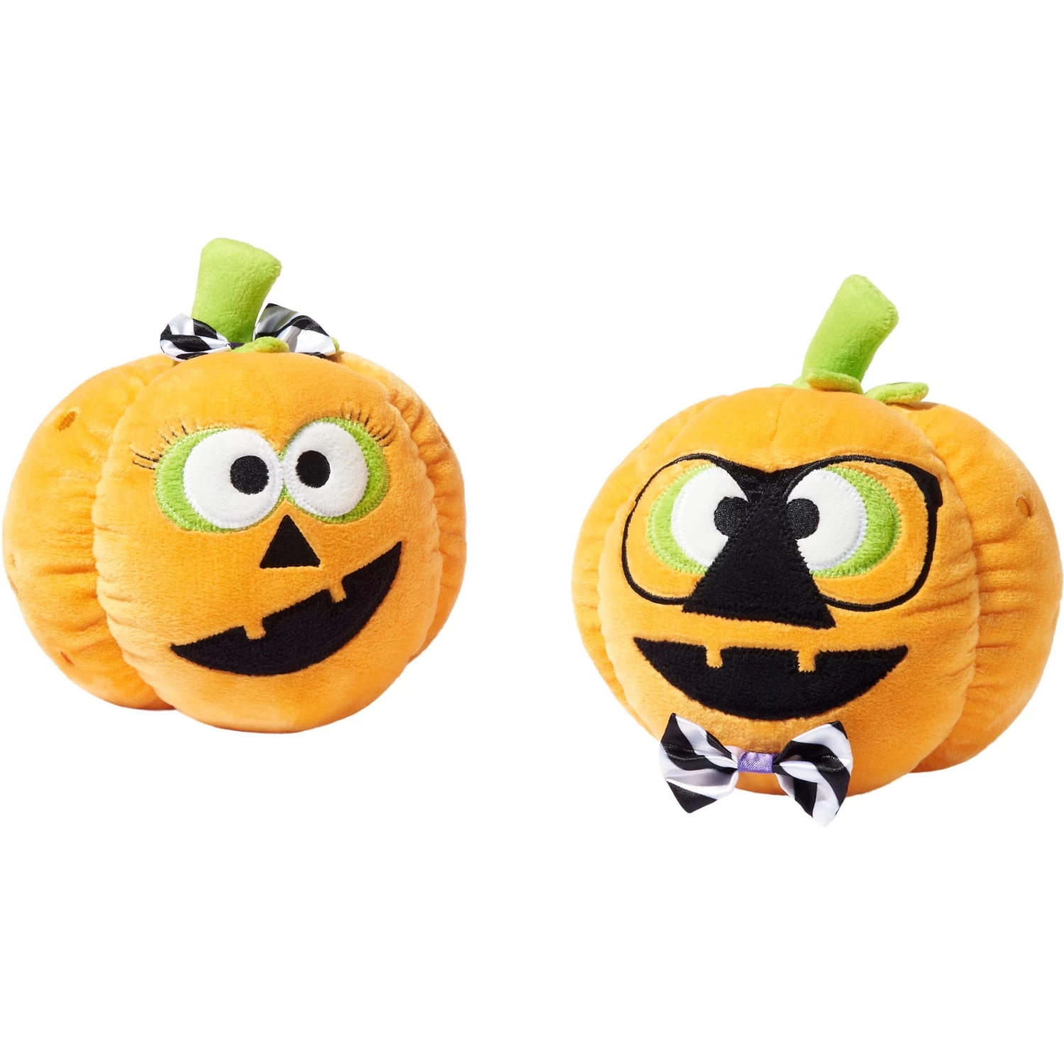 - Two-pack of nerdy jack-o-lantern toys with adorable, goofy faces.