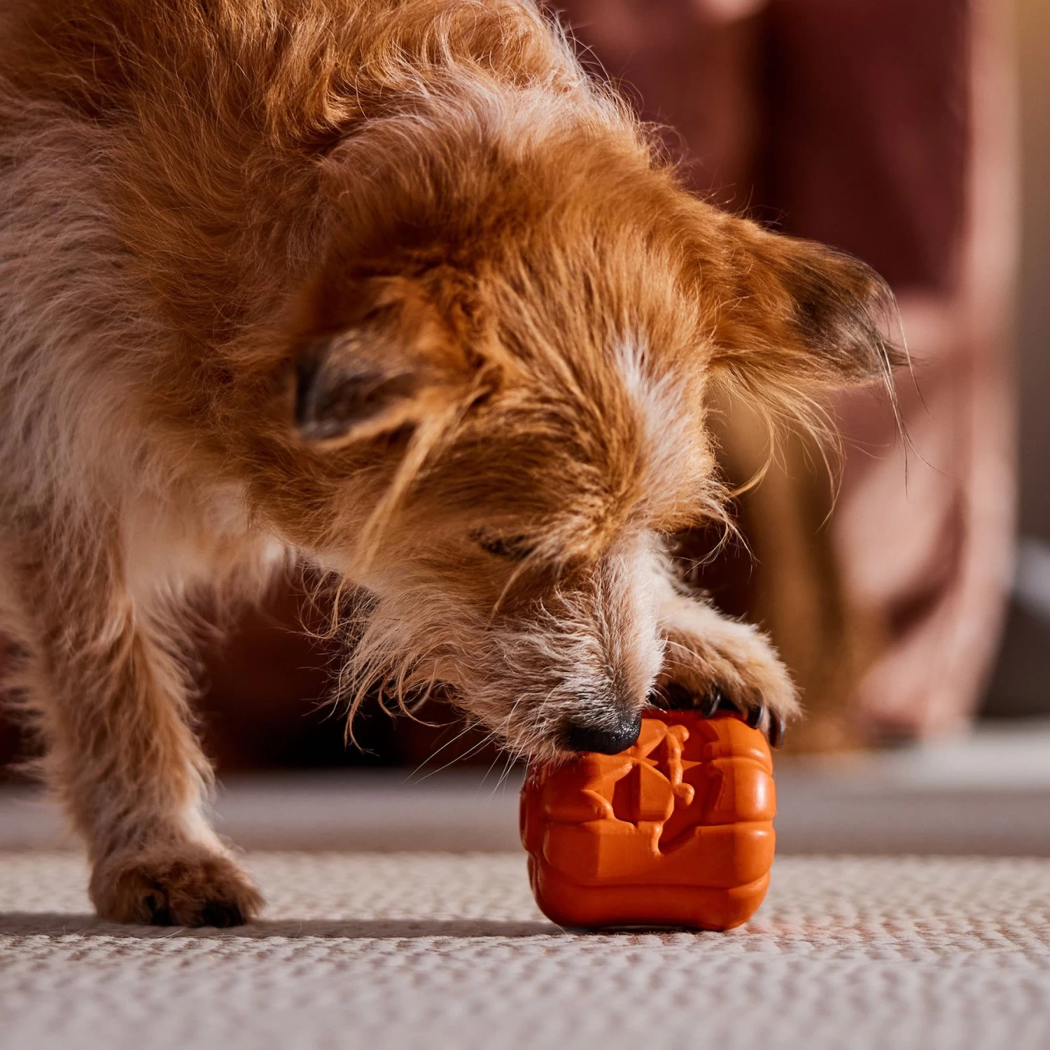 - Fill the opening with your dog’s favorite treat, kibble, or wet food and let them work for it.