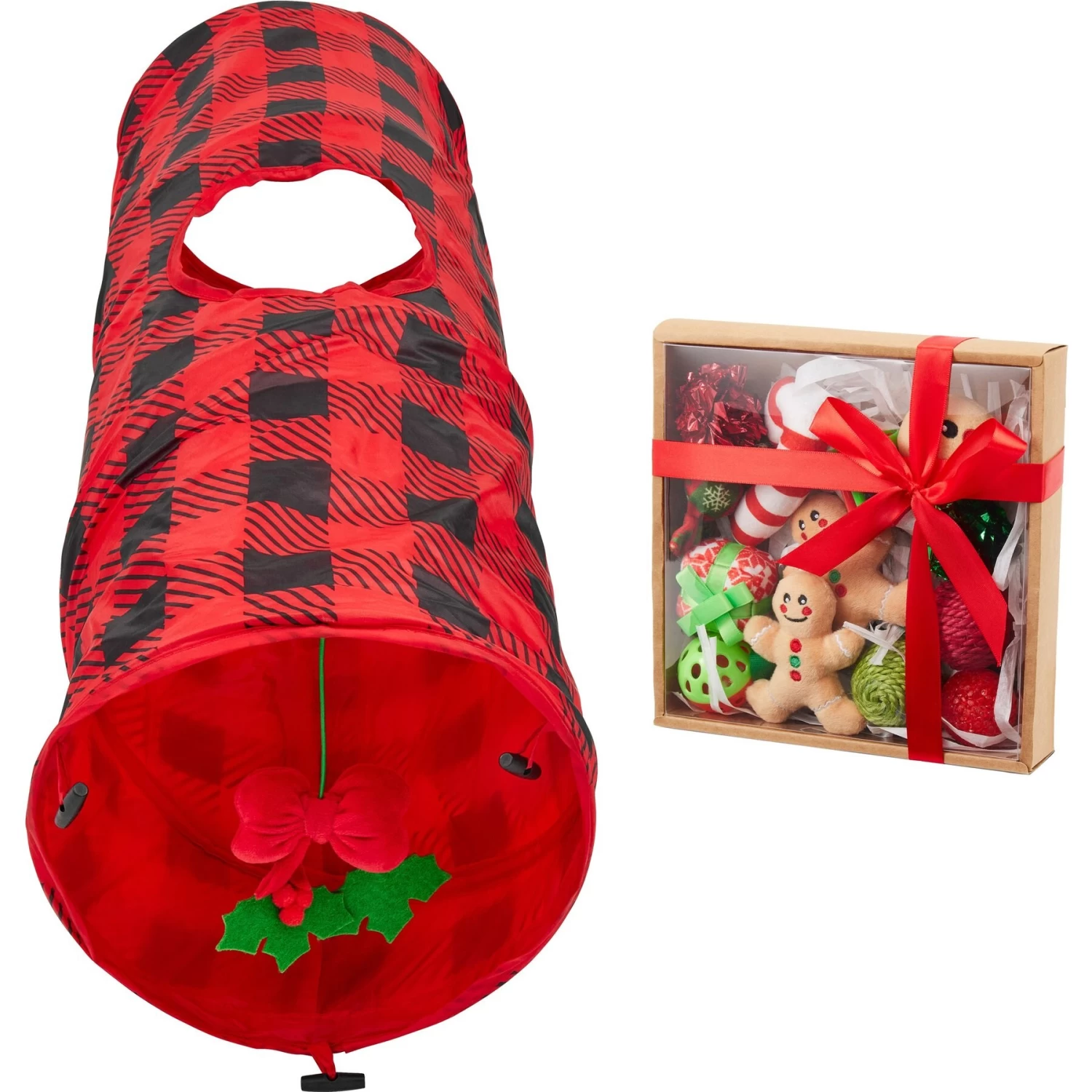 Frisco Holiday Buffalo Plaid Foldable Play Tunnel Cat Toy With Catnip & Frisco Holiday Festive Red Variety Pack Gift Box Cat Toy With Catnip, 14 Count