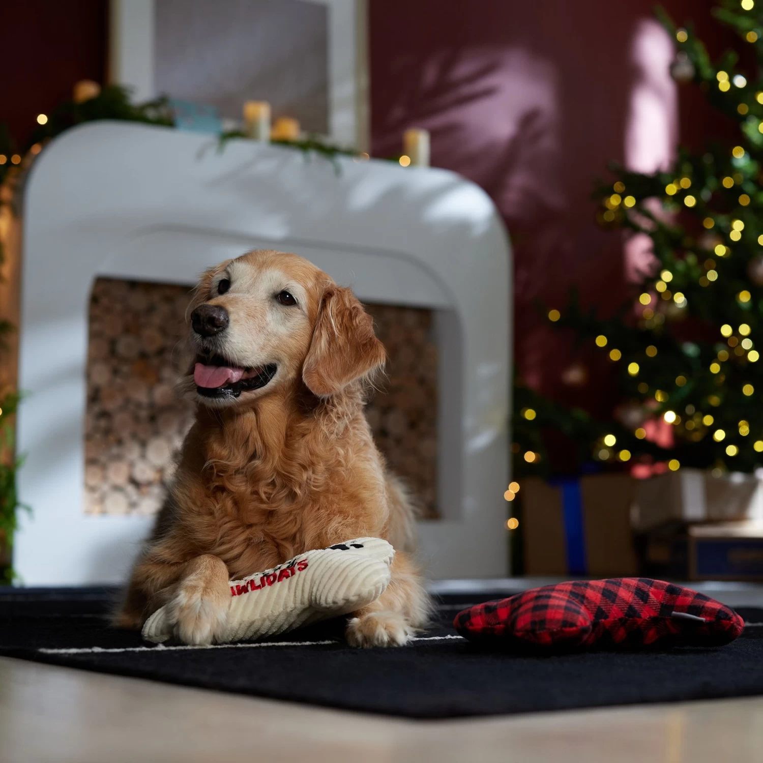 - Happy Pawlidays plush pack features two holiday-themed bone toys. One in red plaid and the other in white corduroy that reads “Happy Pawlidays” for double the delight.