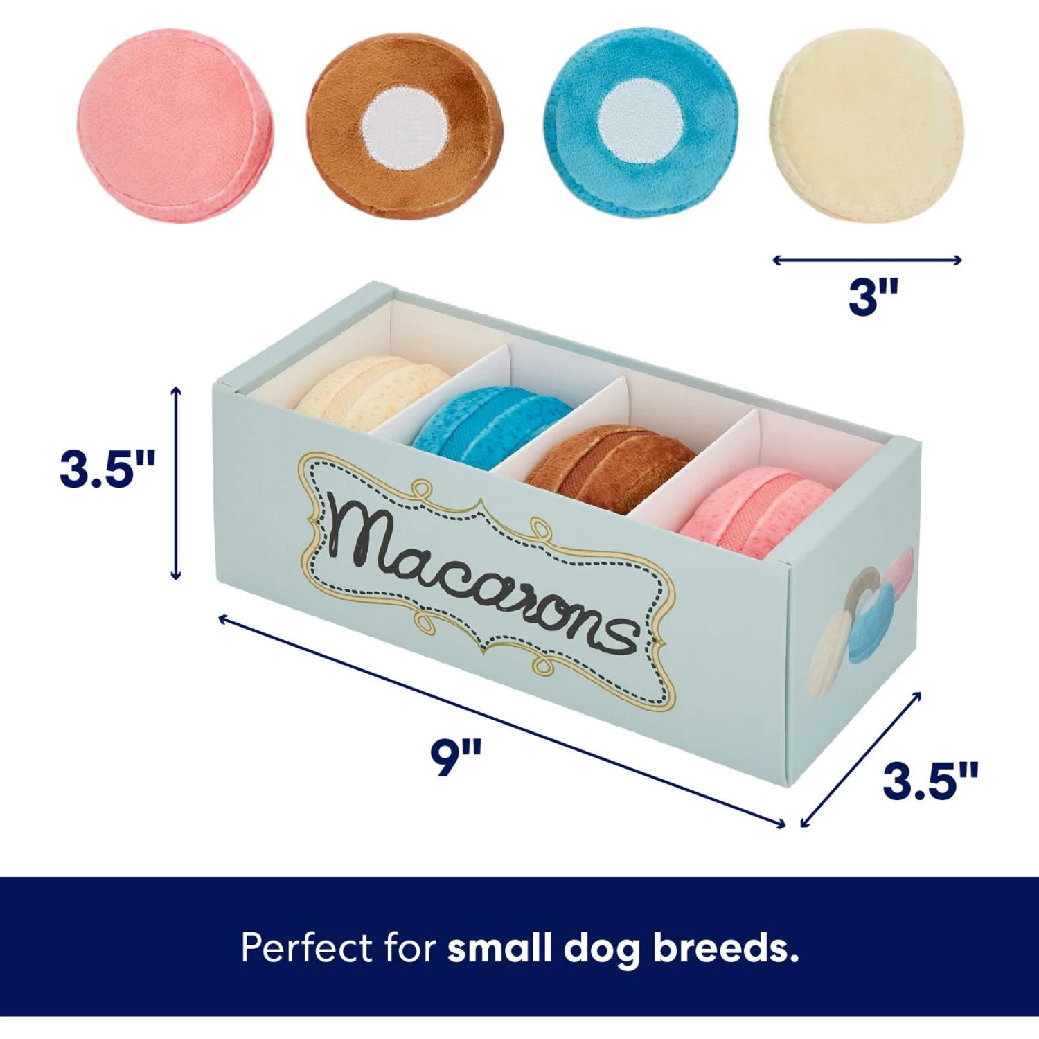 - This four-count plush macaron toy set features hook-and-loop fasteners so your pup can revel in pulling the macarons apart over and over.